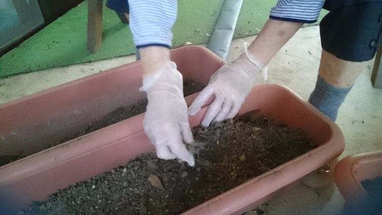 種まき。今年は入居者様よりあり去年の発芽を活かして、2粒ずつ植えようとあり。