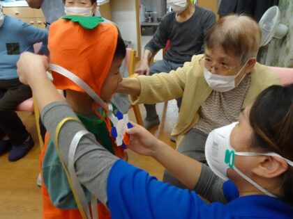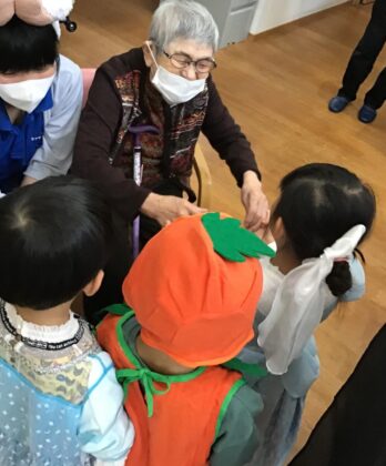10/31にグループホームやつかガーデンとデイホームやつかにてハロウィンの仮装をした、白鳩保育園の園児達がお遊戯を披露してくれました。