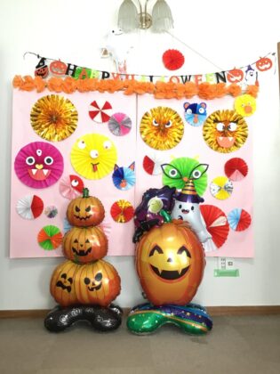 皆様で作成したハロウィンの壁製作の前や仮装した職員と共に記念撮影をいたしました。