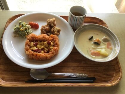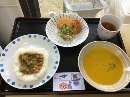 昼食は、ハロウィンメニューを召し上がっていただき、おやつには、魔女に扮した職員よりお菓子のプレゼントをさせていただきました。