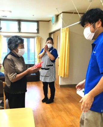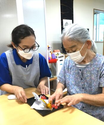 前々より折り紙で金と銀の鶴を、紅葉を好きな位置に配置して置物を作成していました。敬老の日のお祝いとして、記念写真を撮ってお持ち帰り頂きました。