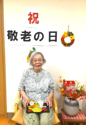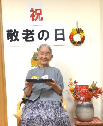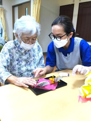 前々より折り紙で金と銀の鶴を、紅葉を好きな位置に配置して置物を作成していました。敬老の日のお祝いとして、記念写真を撮ってお持ち帰り頂きました。